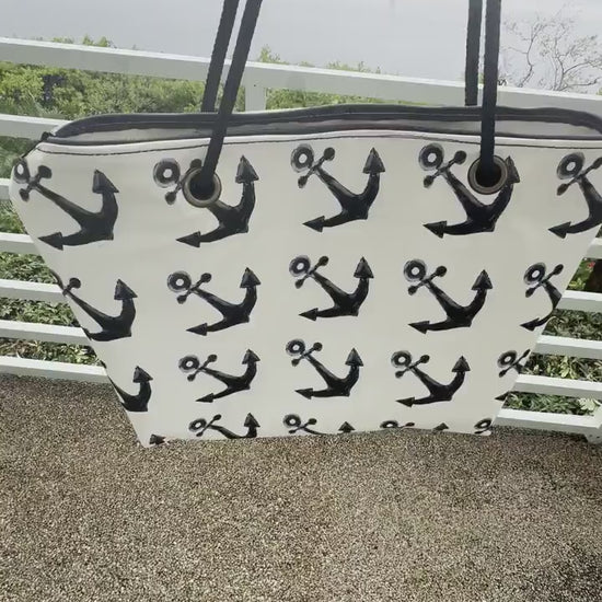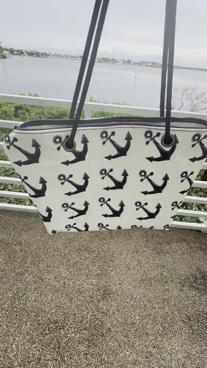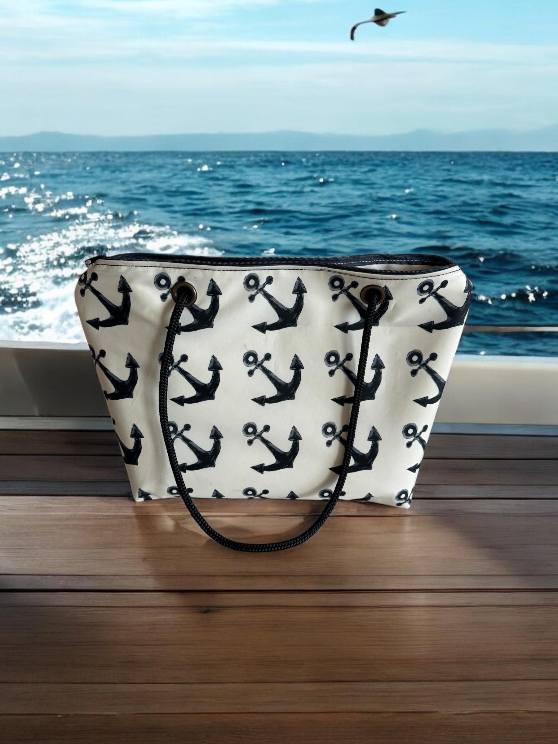 Recycled Sail Tote Bag: Nautical Anchor Design, Zipper Top