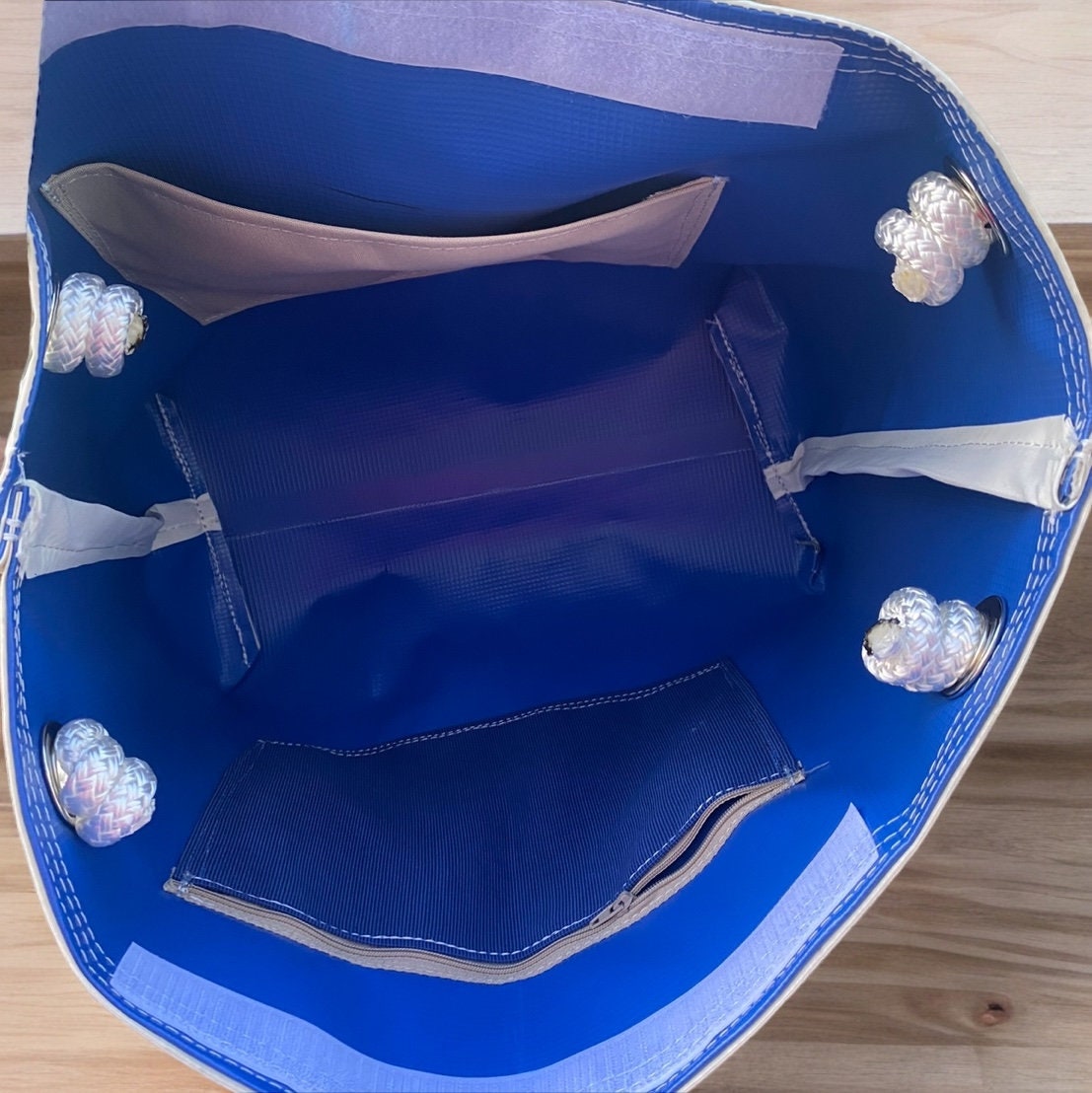 Crafted from durable recycled sailcloth and lined with waterproof marine canvas, this tote is both eco-friendly and one-of-a-kind. Medium, large, crossbody, and wristlet sizes feature convenient zipper tops, while the x-large boasts a secure Velcro closure. Inside, you’ll find a zipper pocket for valuables and an open pocket for easy access.