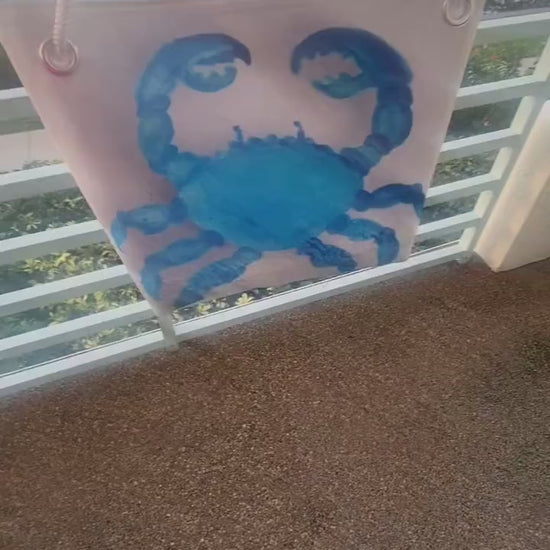 Blue Crab Tote Bag – Handmade from recycled sailcloth with waterproof marine canvas liner. Eco-friendly beach tote featuring original blue crab artwork on both sides, perfect for coastal style and everyday use.